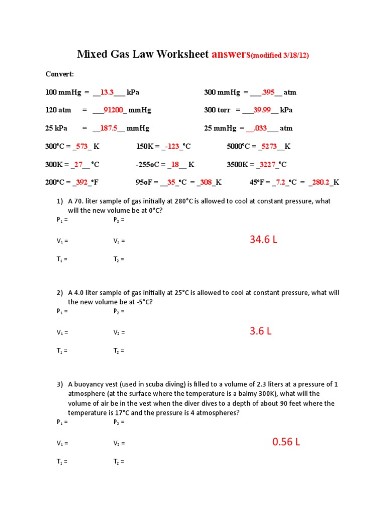 For any amount of gas, you can determine its state by its volume, temperature, and pressure. The ideal gas equation is: Derives equations to calculate entropy changes for an ideal gas as temperature and pressure changes. (d) an ideal gas is one that obeys the gas laws. Match each variable listed on the left with the appropriate unit of. By rearranging the ideal gas law (ideal gas equation) pv=nrt, it can be used to calculate the pressure (p), volume (v), temperature (t) or amount (n) of gas worksheet wizards to make printable worksheets or tests. An ideal gas is contained in a cylinder with a volume of 5.0 x 102 ml at a temperature of 30 oc and a pressure of 710 torr. Using the ideal gas law to calculate a change in volume. Gas laws packet ideal gas law worksheet pv = nrt. The value of characteristic gas constant for carbon dioxide would be. Gas mixtures and partial pressures. This means that according to the ideal gas equation, the product of pressure and volume of a gas bears a constant relation (it is proportional). In this worksheet, we will practice using the combined gas equation to relate the pressure, volume, and temperature of two systems and calculate unknowns.